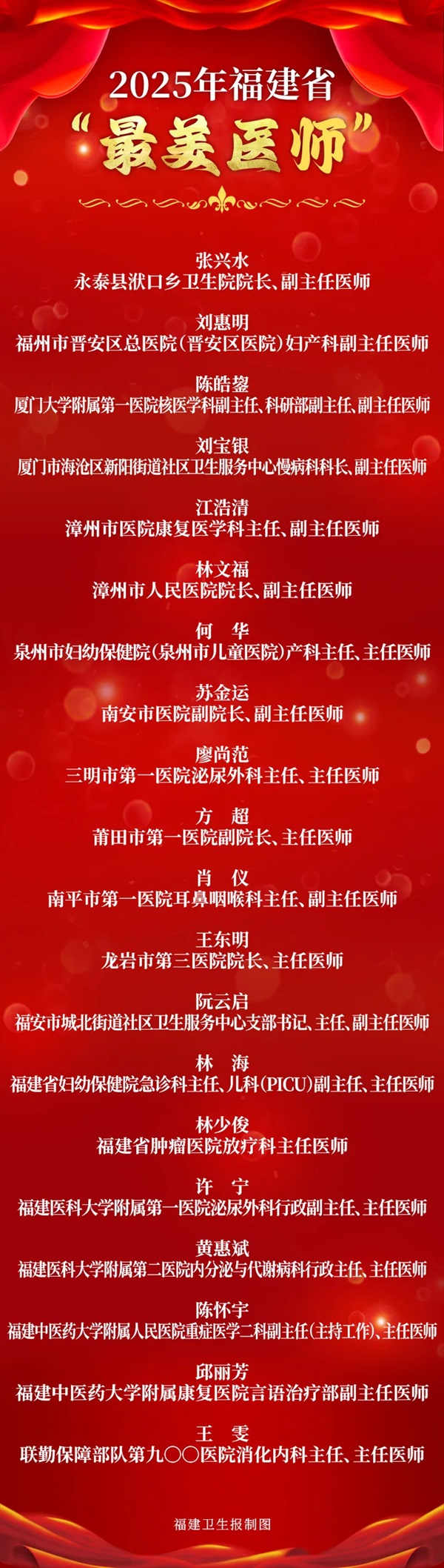 福建已连续八年举办中国医师节省级庆祝活动,通过树立先进典型、弘扬职业精神、营造尊医重卫氛围,不断激发广大医务工作者的荣誉感、自豪感与使命感,为推进健康福建、健康中国建设汇聚磅礴力量。