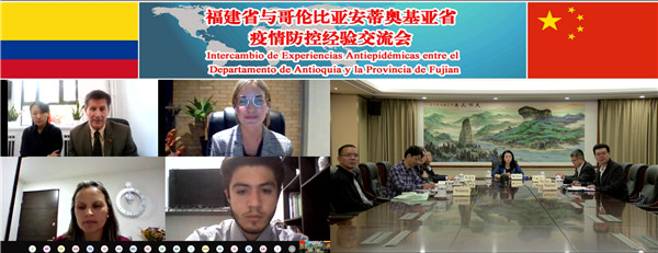 为推动与拉美国家抗疫合作,助力我省友好伙伴哥伦比亚安蒂奥基亚省防控疫情,2021年4月27日上午,福建省与安蒂奥基亚省疫情防控经验交流会在省外办以视频连线的方式举行。
