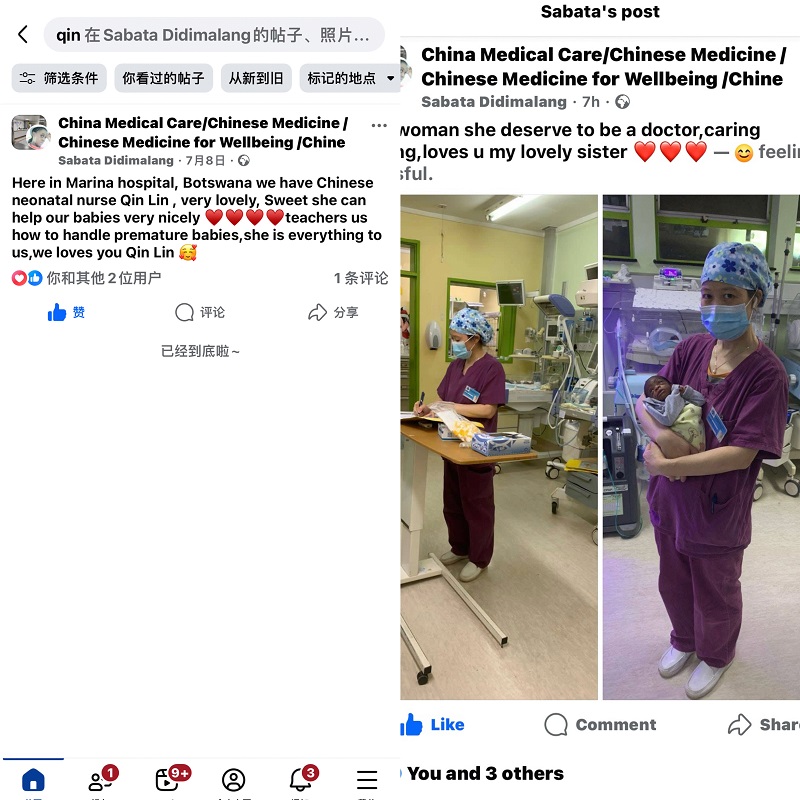 近日,中国第17批援博茨瓦纳医疗队新生儿科护士林琴,在玛丽娜公主医院成功抢救数名出生体重低于1000g的早产儿,并在早产儿病房开展健康科普宣教工作,受到早产儿妈妈在Facebook(脸书)的公开点赞。家属称赞林琴护士富有爱心,既悉心照料呵护早产儿,还尽心尽力指导早产儿母亲做好护理,她不仅仅能当一名护士,更值得成为一位充满爱心的好医生。该帖子是中非医疗合作的生动写照,也是中非人民友好情谊的温暖体现。