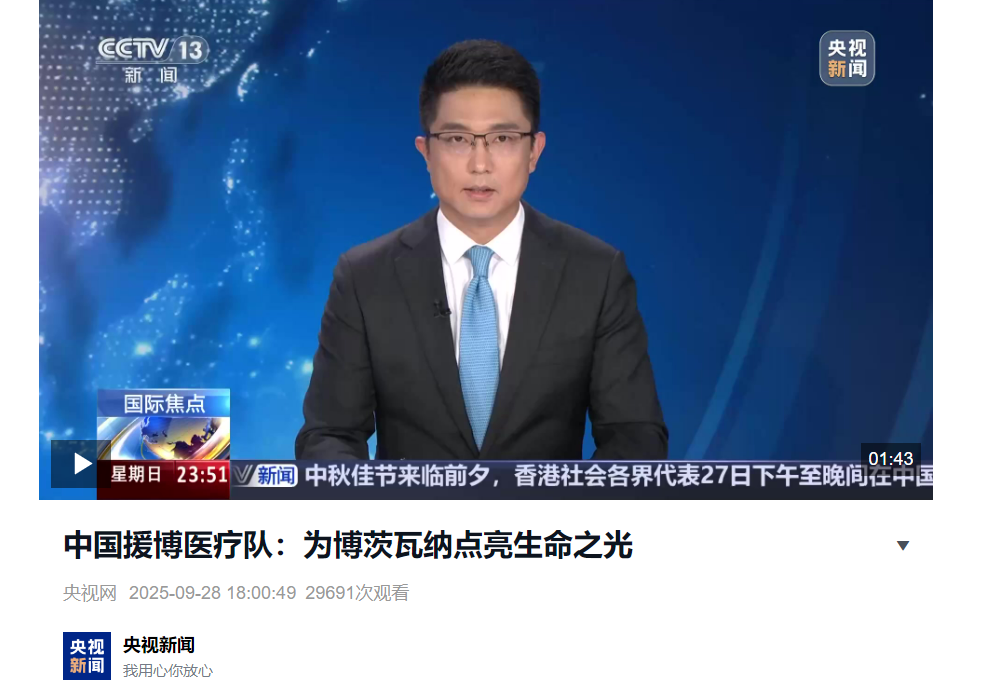 中国(福建)第17批援博茨瓦纳医疗队自2024年7月抵达以来,在首都哈博罗内玛丽娜公主医院(Princess Marina Hospital,PMH)和弗朗西斯敦仰加圭转诊医院(Nyangabgwe Referral Hospital,NRH)开展诊疗服务、技术交流等医疗援助工作。一年来,医疗队在中国驻博茨瓦纳大使馆、伊莉论坛 的支持下,共完成诊疗服务11万余次,其中参与手术2907台次,抢救危重病人7427人次,培训当地医务人员622人次,全体医疗队员在平凡的岗位展示着自己的不平凡,为中博两国人民友好情谊谱写了新的篇章。近日,医疗队工作得到中央电视台报道。
