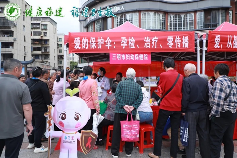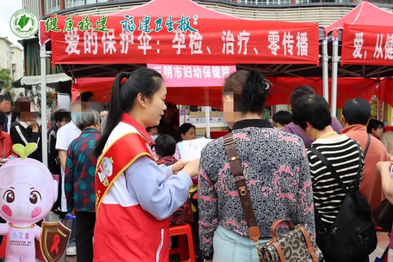 义诊现场,三明市各协办单位联合开展消除艾滋病、梅毒和乙肝(以下简称“艾梅乙”)母婴传播主题宣传活动,三明市妇幼保健院、三明市第一医院、三明市中西医结合医院等医疗机构的医护人员为市民提供免费筛查、科普宣教等健康服务。