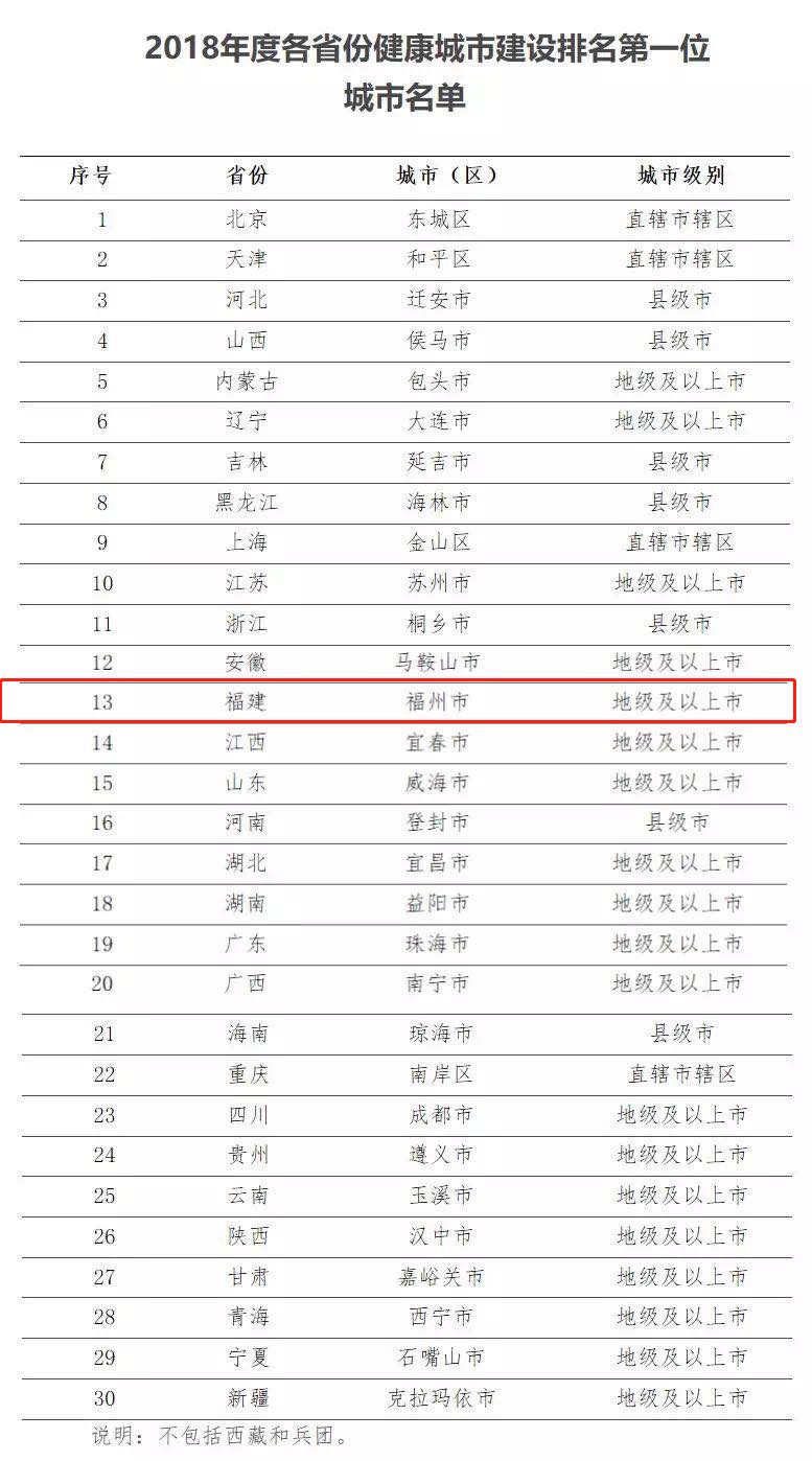 近日,全国爱卫办印发《关于全国健康城市评价结果的通报》,通报了全国健康城市评价结果,对2018年度全国健康城市建设示范市、各省份排名第一位城市及进步最快城市予以表扬。福州位列我省健康城市建设第一名!