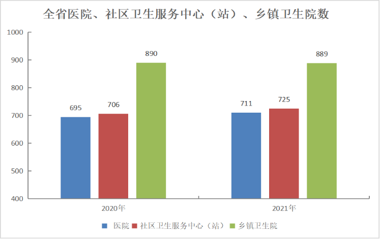 2021年末,全省医疗卫生机构总数28693个,比上年增加541个。其中:医院711个,基层医疗卫生机构27463个,专业公共卫生机构392个。与上年相比,医院增加16个,基层医疗卫生机构增加514个。全省共有6个国家区域医疗中心。
