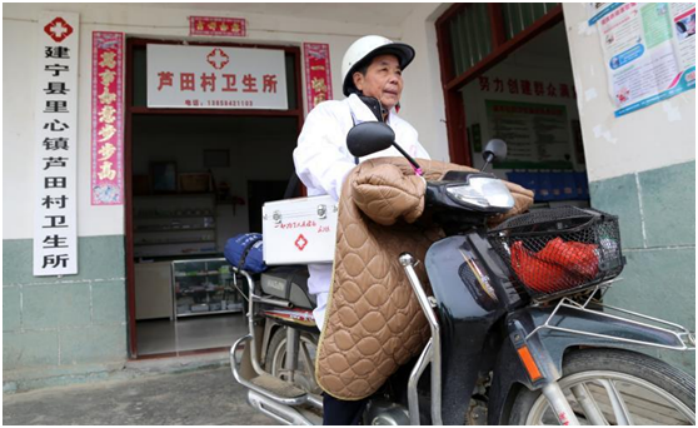 年近古稀的建宁县里心镇芦田村村医尤金土自从抗疫以来,每天重复的一件事,就是一大早背上药箱,骑着摩托车,挨家挨户走访。