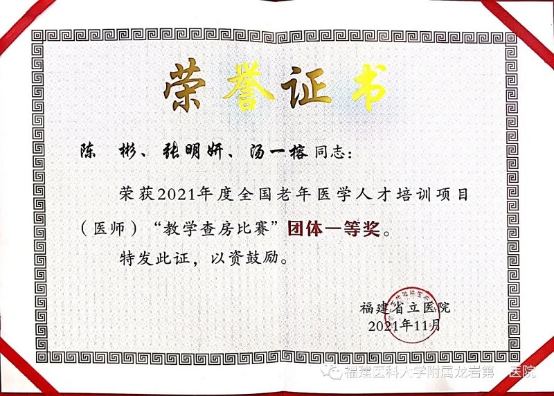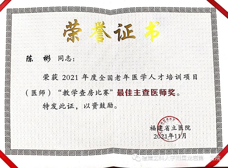 为落实国家卫生健康委与福建省关于老年健康的工作要求,提高老年医学人才队伍整体素质和专业水平,来自全省各级医疗机构老年医学科和医养结合机构的骨干医师代表在福建省立医院进行了为期90天的培训。龙岩市第一医院全科医学科、老年医学科副主任医师陈彬作为龙岩市卫健委派出的第一批老年医学人才,在此次培训中取得优异成绩,荣获2021年度全国老年医学人才培训项目(医师)“教学查房比赛”最佳主查医师奖、2021年度全国老年医学人才培训项目(医师)“教学查房比赛”团体一等奖等奖项。
