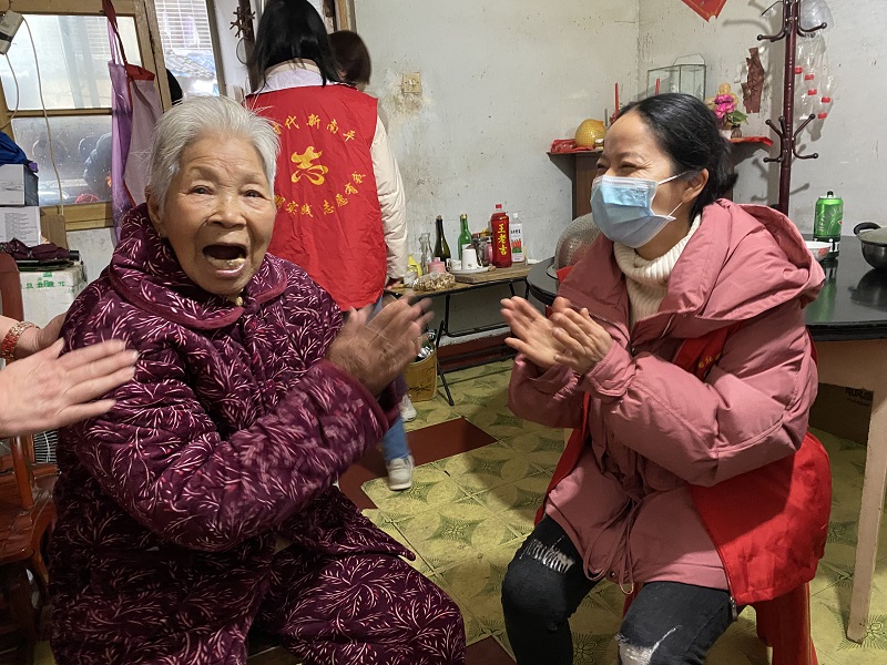 桥南社区志愿者陪伴百岁老人聊天