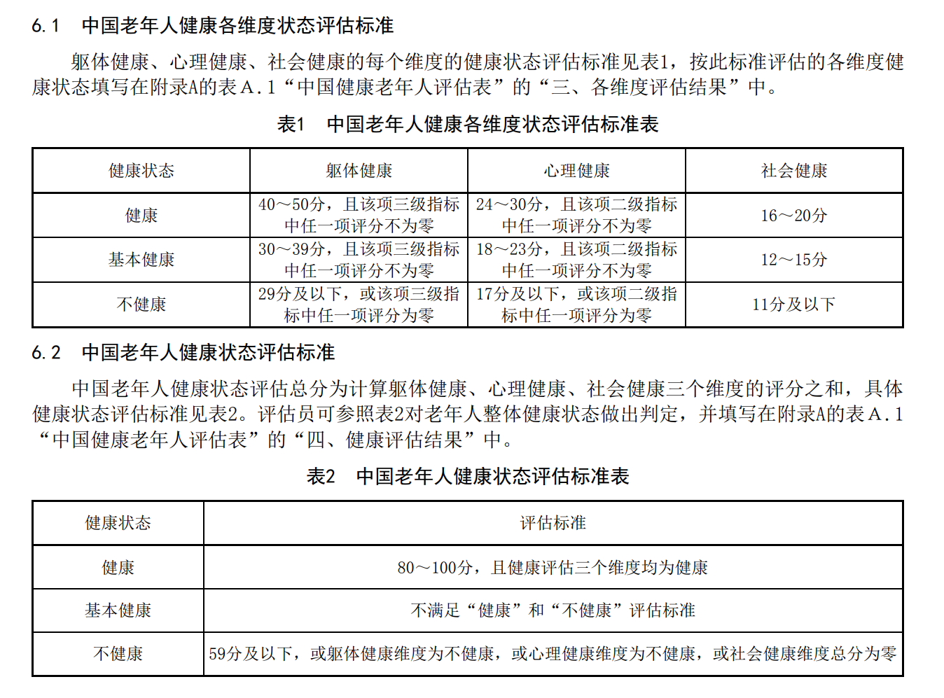 《中国健康老年人标准》适用于医疗卫生机构、养老服务机构人员等对60周岁及以上中国老年人健康状态的评估。该《标准》明确,中国健康老年人应生活自理或基本自理;重要脏器的增龄性改变未导致明显的功能异常;影响健康的危险因素控制在与其年龄相适应的范围内;营养状况良好;认知功能基本正常;乐观积极,自我满意;具有一定的健康素养,保持良好生活方式;积极参与家庭和社会活动;社会适应能力良好。评估人员通过询问评估对象或其照顾者,按照评估项目进行逐项评估,填写每个三级指标评分,并计算躯体健康、心理健康、社会健康每个维度的分值,划分“健康”“基本健康”“不健康”3个健康状态。