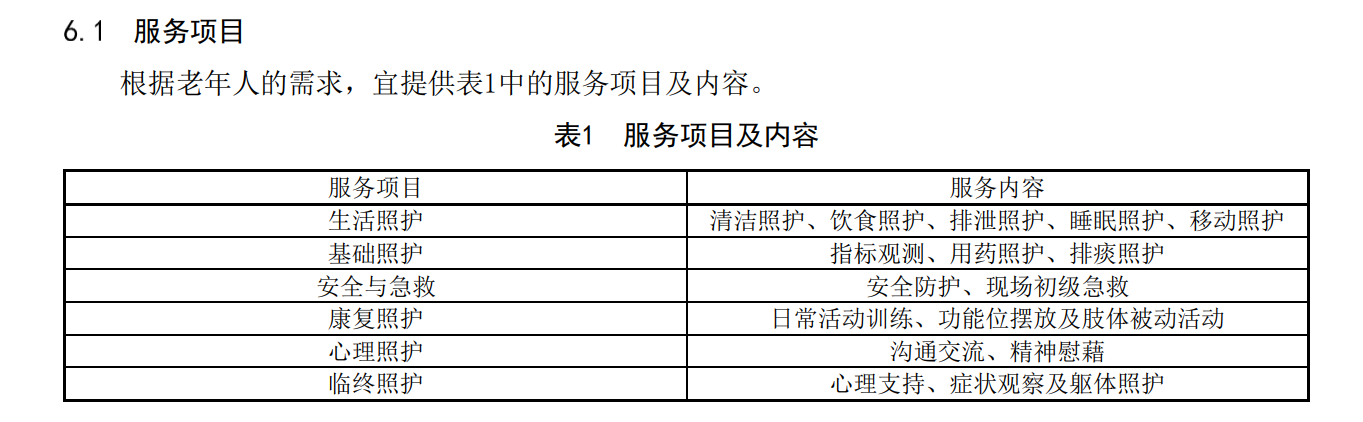 《居家、社区老年医疗护理员服务标准》规定了居家、社区老年医疗护理员服务的基本要求、流程、项目及要求等。该《标准》明确,医疗护理员是指主要提供辅助护理等医疗辅助的服务人员,老年医疗护理员是指以老年人为主要服务对象的医疗护理员。老年医疗护理员应经过专门培训,并考核合格;可根据老年人的需求,提供生活照护、基础照护、安全与急救、康复照护、心理照护、临终照护,且不应涉及医疗护理专业技术性工作。比如,在安全与急救方面,可提供安全防护、现场初级急救;在康复照护方面,可提供日常活动训练、功能位摆放及肢体被动活动;在心理照护方面,可提供沟通交流、精神慰藉;在临终照护方面,可提供心理支持、症状观察及躯体照护。