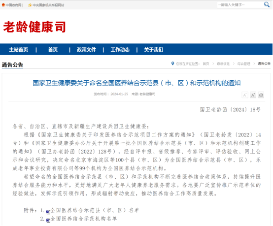 1月25日,国家卫生健康委发布通知,决定命名100个县(市、区)为全国医养结合示范县(市、区),99个机构为全国医养结合示范机构。其中,福建3地、2机构入选