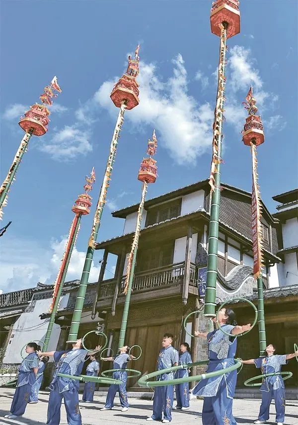 建瓯挑幡是福建省建瓯市的民间绝活,是国家级非物质文化遗产代表性项目之一。经过传承发展,建瓯挑幡如今有了多种形式的表演队伍,经常在各大活动中展示。图为2023年12月6日,演出队伍在历史文化街区表演建瓯挑幡。福建日报社供图 游庆辉/摄