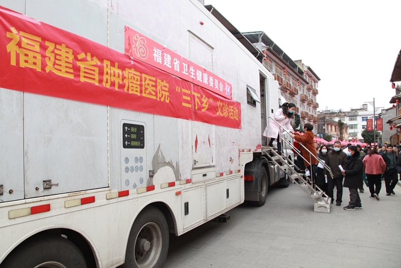 福建省肿瘤医院胸部肿瘤外科陈炜生主任医师团队及胸部肿瘤内科、放诊科、护理等医护人员在车载移动CT医疗车的助力下开展肿瘤筛查,通过提供肿瘤筛查、血压血糖检测、义诊咨询服务,直接服务当地群众600余人次,CT筛查90余人,免费发放健康防疫包100余包、防疫口罩2000多个和《常见肿瘤预防与筛查建议》科普宣教手册200余册,义诊专家详细、耐心地解答群众咨询,向群众传授普及科学防癌抗癌知识,引导群众正确认识癌症,养成健康生活方式,使农村群众在家门口就能享受到省级医疗服务。