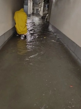 ▲医护人员在东大路某积水楼道,准备接转救治一位孕4个月出血患者
