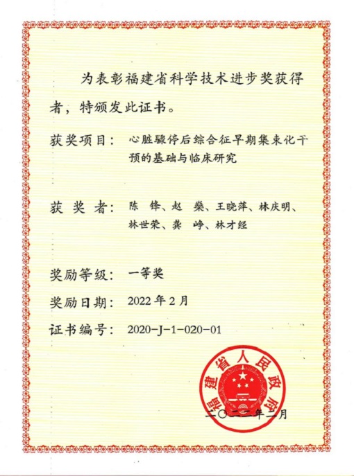 ▲《心脏骤停后综合征早期集束化干预的基础与临床研究》获福建省科学技术进步奖一等奖