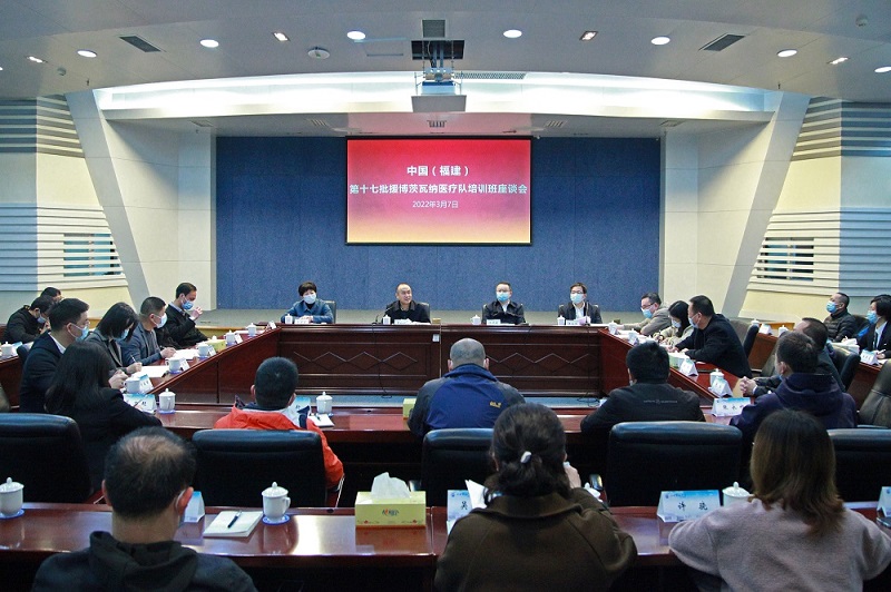 3月7日下午,省卫生健康委党组书记、主任黄如欣赴福建医科大学,看望正在参加出国前集中培训的第17批援博茨瓦纳医疗队全体预备队员,认真听取医疗队前期培训开展情况的汇报,并与全体预备队员座谈交流。福建医科大学党委书记陈晓春,党委常委、副校长佘菲菲参加座谈。