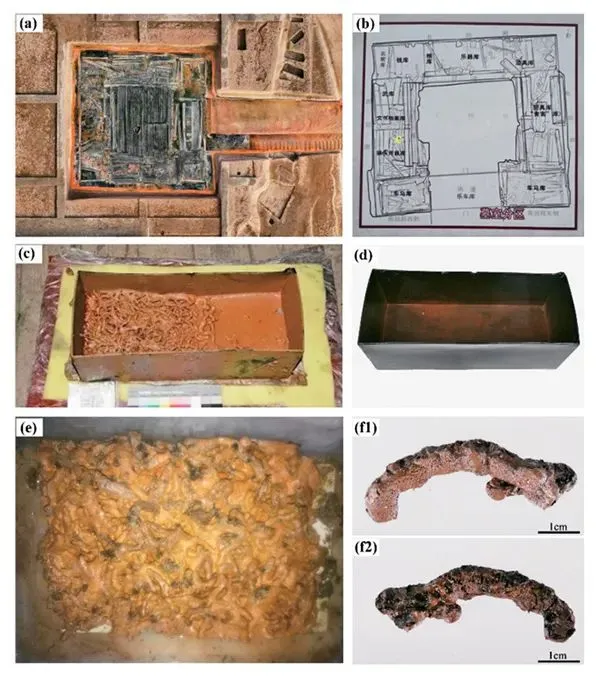 西汉海昏侯墓曾出土装有半盒疑似虫草类样品的木质漆盒。研究发现,该样品为玄参科地黄属植物根的辅料炮制品,其外层辅料有淀粉和蔗糖等成分,这是迄今发现的最早的中药辅料炮制品。图为海昏侯墓园主墓及平面图、出土的漆盒及其中的地黄炮制品。 (图片来源:中国中医科学院)
