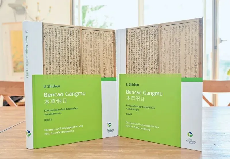 明代李时珍撰写的《本草纲目》是世界范围内最受欢迎、影响最大的中医药古籍之一,也是被联合国教科文组织列入《世界记忆名录》的文献遗产。《本草纲目》第一卷完整德译本不久前在德国出版发售。图为2024年9月4日在德国柏林拍摄的该译本。 新华社记者 任鹏飞/摄
