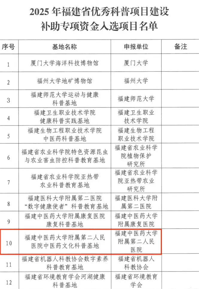 近日,福建省科学技术协会公布了2025年福建省优秀科普项目建设补助专项资金入选项目,按照《福建省科协、中共福建省委宣传部、福建省教育厅关于做好2025年福建省优秀科普项目申报工作的通知》(闽科协普〔2024〕18号)要求,经广泛发动、择优推荐、资格审查、专家评审、入围公示,全省共入选20个项目,福建中医药大学附属第二人民医院中医药文化科普基地成功入选。