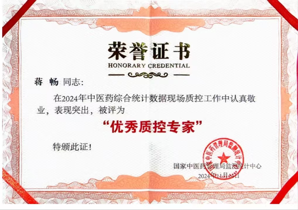 2024年11月14日,由国家中医药管理局监测统计中心主办的2024年度中医药综合统计(直接调查部分)培训会在重庆顺利召开。此次会议中,福建省中医药综合统计业务支撑机构——福建省中医药科学院的蒋畅同志,因在2024年中医药综合统计数据现场质控工作中认真敬业,表现突出,被国家中医药管理局监测统计中心评为“优秀质控专家”并获荣誉证书。