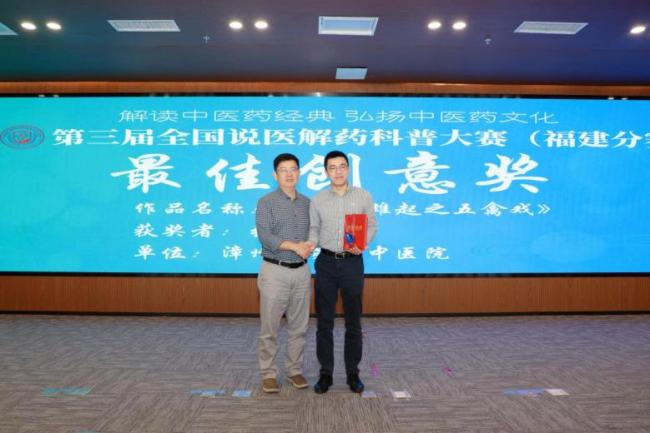 福建省中医药学会科普分会副主任委员黄剑教授为最佳创意奖获得者颁奖