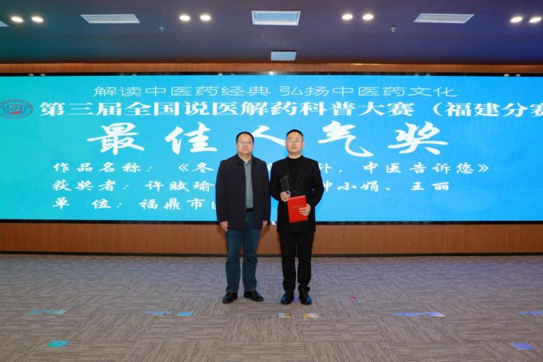 福建省中医药学会科普分会副主任委员姚木铭教授为最佳人气奖获得者颁奖