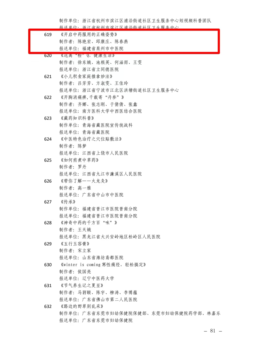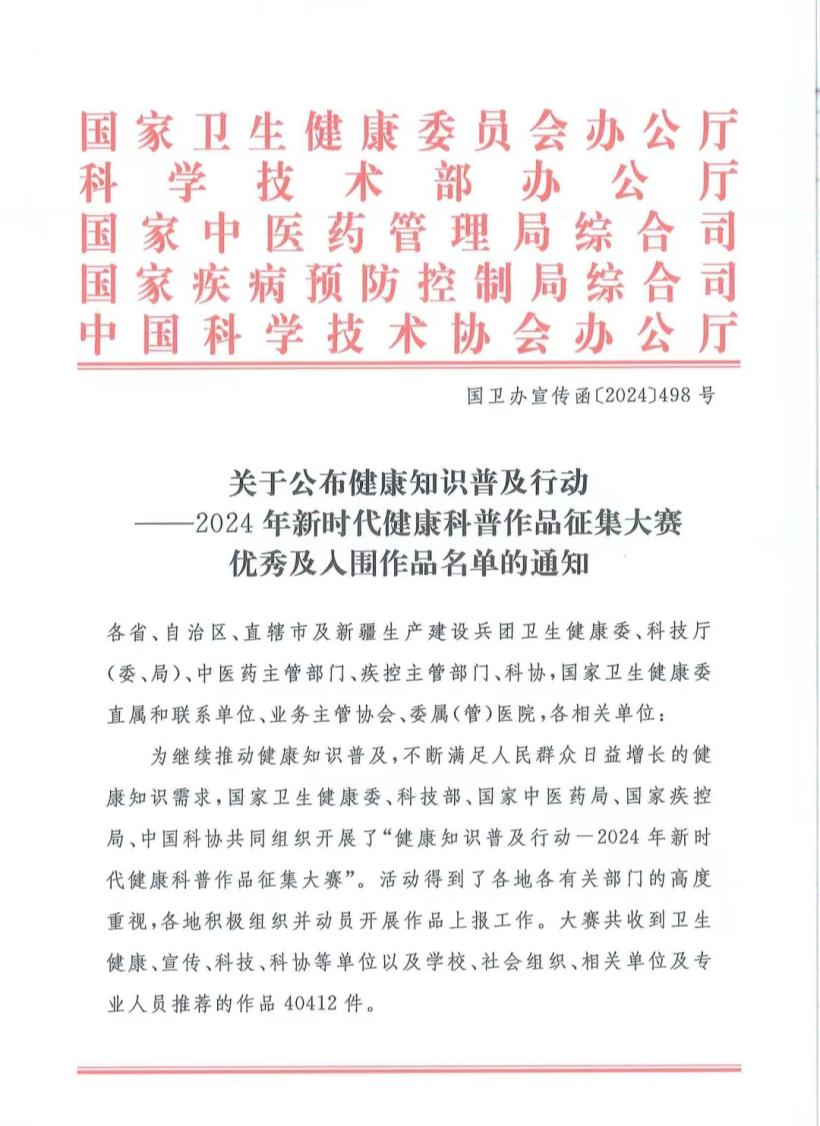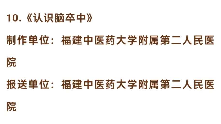 日前,国家卫生健康委办公厅等单位公布健康知识普及行动--2024年新时代健康科普作品征集大赛优秀作品及入围作品名单,由泉州市中医院报送的《开启中药服用的正确姿势》、由福建中医药大学附属第二人民医院报送的《认识脑卒中》入选视频类作品。