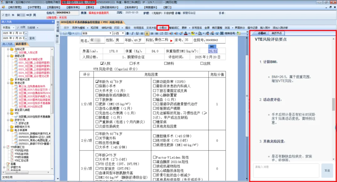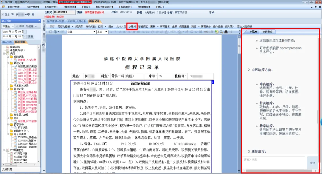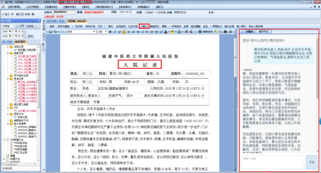 电子病历系统接入的DeepSeek R1智能助手,实现了与门诊病历、入院记录、病程记录、出院记录、评估表单等核心病历文书的同屏操作。医生在书写病历的同时,可以结合病人基本信息和主要病情,向智能助手求助。智能助手能够结合场景和临床诊疗规范,分析病历文书内容,提供分析思路和参考结果。例如,医务人员可借助智能助手快速提取病历关键信息,为诊疗决策提供参考,咨询病历书写内容的完整性、合理性,确保病历质量,符合质控要求。