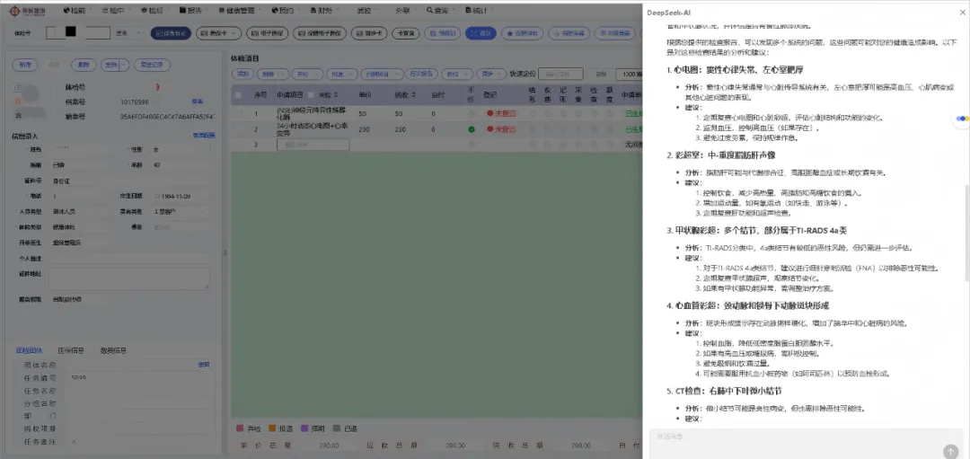 体检系统通过对接DEEPSEEK 实现智能诊断辅助,减少人工遗漏;依据客户历史检查结果,支持历史比对并智能生成比对图,提升报告可读性;借助 AI 助力专业知识库实时更新,输出个性报告解读。