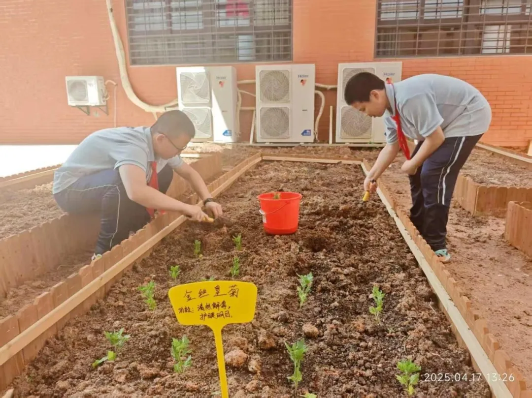 基地从无到有的背后,是多方协作的成果。为了给中草药提供适宜的生长环境,学校相关部门克服重重困难。德育处、教务处统筹规划,将劳动教育与中医药文化传承有机结合;保卫科、总务处全力保障施工安全与物资供应;物业工作人员不辞辛劳,完成找土、耕地等基础工作。在选种、育苗、栽种的关键阶段,初一校本课的同学们热情高涨,积极参与其中。他们亲手播种、悉心照料,用汗水浇灌希望,见证着一株株幼苗茁壮成长。“看着自己种下的草药茁壮成长,特别有成就感,也学到了很多书本上学不到的知识。”这是很多参与其中的学生们最大的感悟。
