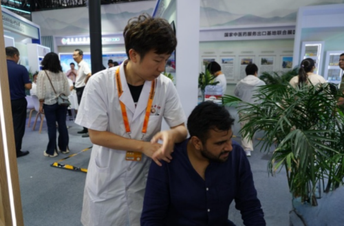 外国友人在厦门市中医院展区体验耳穴埋豆