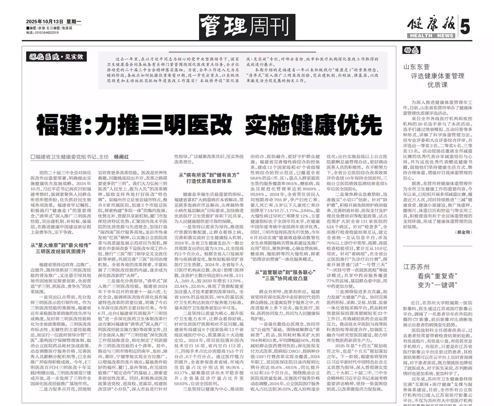党的二十届三中全会对深化医改作出重要部署,明确提出实施健康优先发展战略。2024年10月,习近平总书记再次回到福建考察时,强调要聚焦人民群众所思所想所盼,优先抓好民生领域各项改革。福建省牢记嘱托,积极践行“健康是1”的重要理念,“清单式”深入推广三明医改经验,突出建机制、补短板、强基层,在推进健康中国建设新征程上奋勇争先,实干争效。