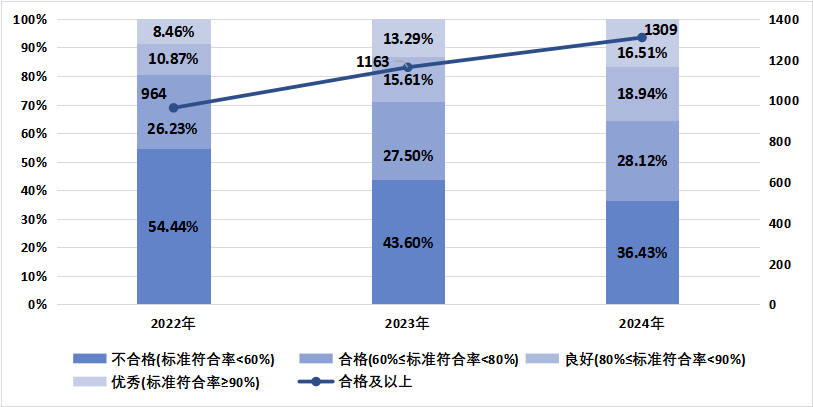 为进一步完善医疗卫生服务体系,落实分级诊疗制度,不断提升县医院医疗服务能力,我委持续开展县医院医疗服务能力第三方评估。2024年度参评医院2059家,县域覆盖率98.93%。根据我委2016年印发的县医院医疗服务能力基本标准和推荐标准(其中,基本标准相当于二级医院能力,推荐标准相当于三级医院能力),有1922家(占比93.35%,提高1.50个百分点)符合基本标准,1309家(占比63.57%,提高7.17个百分点)符合推荐标准,较2023年度分别增加28家、146家(见图1、图2)。现将2024年度评估情况通报如下: