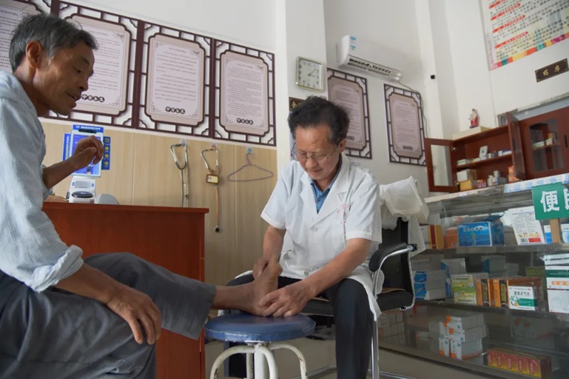 村医吕金昌为患者脚部检查诊断。
