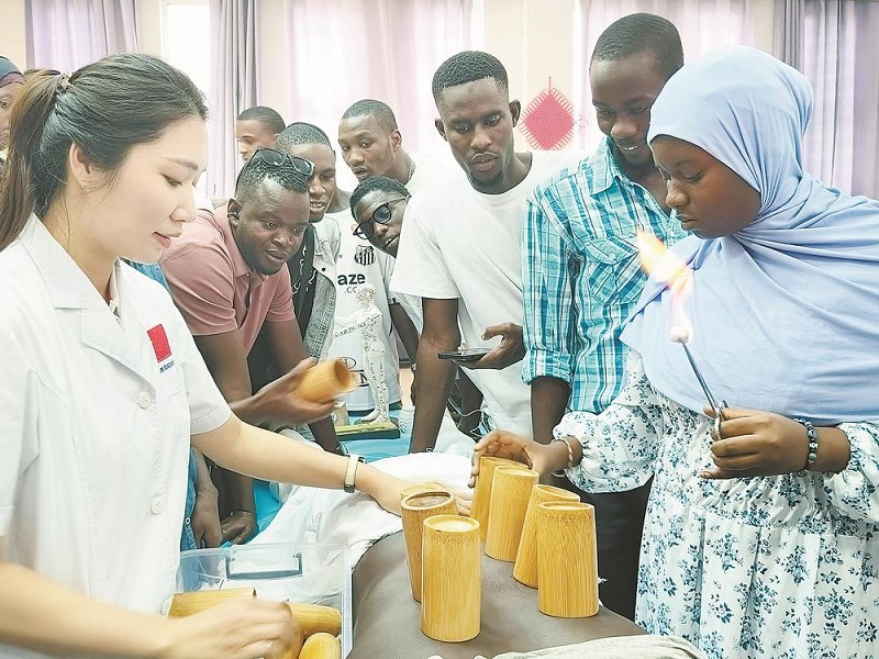 医疗队授课团队手持艾条与火罐,向非洲学子展示艾灸温通经络、拔罐祛除湿寒的东方智慧。在亲身体验中医的独特疗效后,学员穆斯塔法感叹:“这和我们在医院学的完全不同!”