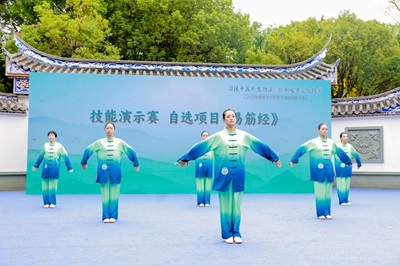 在屏山公园的技能演示中,选手们展示了八段锦、五禽戏、太极养生杖、导引养生功十二法等经典功法,吸引了众多市民驻足观看。知识竞答环节围绕《黄帝内经》《伤寒论》等经典及功法理论展开,展现了选手扎实的理论功底与应变能力。