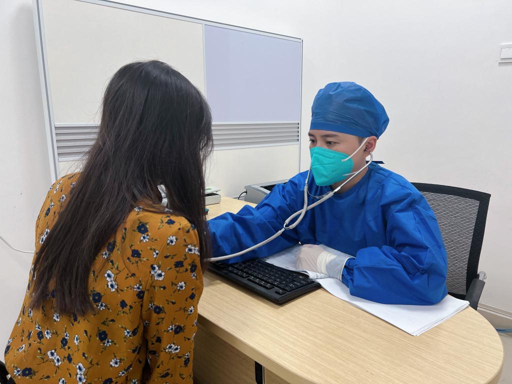 5月31日,在江西省人民医院发热门诊,医生为一名患者做检查。新华社记者 闵尊涛 摄