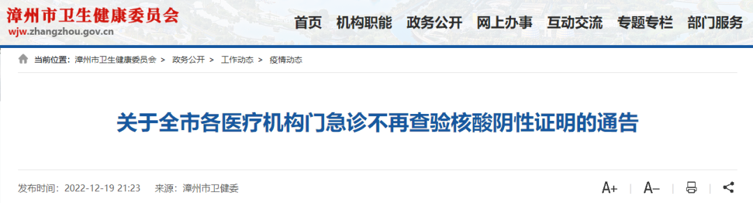 根据漳州市当前疫情形势,为进一步优化就医流程,方便市民看病就医,自2022年12月20日零时起,全市各医疗机构,除新入院患者及陪护人员外,门急诊不再查验核酸阴性证明;市民如就诊前已知自身核酸或抗原检测阳性,请在进入医疗机构时主动告知工作人员。