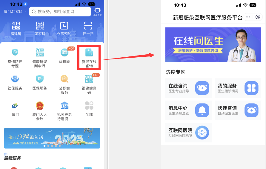 搭建面向全省居民的新冠病毒感染互联网咨询平台,居民通过闽政通app【新冠在线咨询】或闽政通【福建健康码】的【互联网医院】进入服务,享受直接、免费、便利的新冠病毒感染相关咨询服务,方便群众及时获取新冠病毒感染相关信息,满足居民咨询需求。