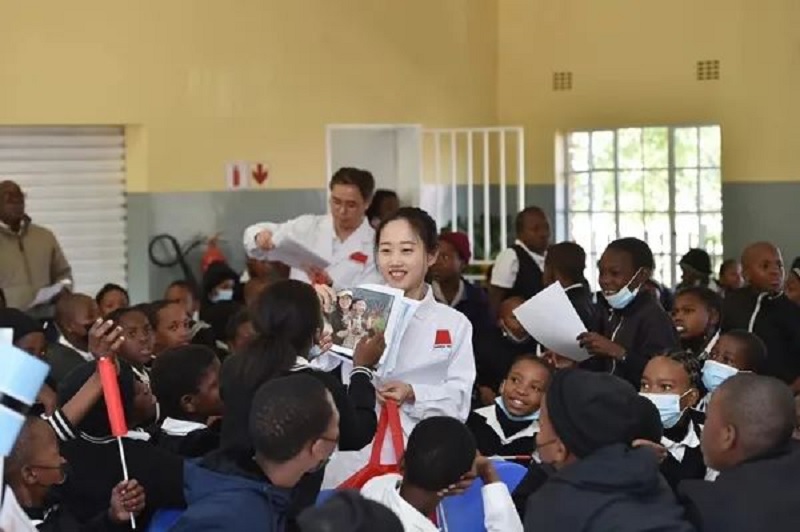 在博茨瓦纳,“中非携手暖童心”活动走进茨瓦拉哈诺小学,中国驻博茨瓦纳大使王雪峰及夫人童新陪同博总统夫人妮奥·马西西慰问孩子们并捐赠“爱心包”,援博医疗队现场为孩子们讲授卫生健康知识。