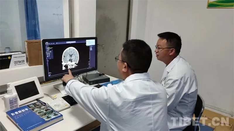 图为医疗队队员对脑梗患者的颅脑CT进行阅片