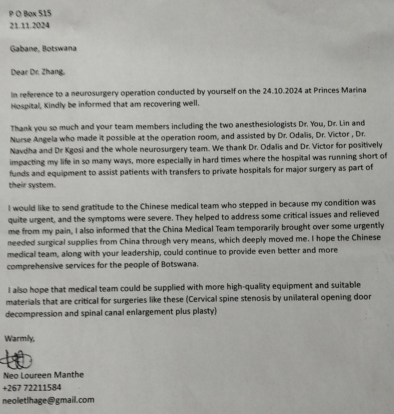 在博国,此类手术难度较大需备好ICU病房,但当时玛丽娜公主医院的ICU床位需要等待2周以上。考虑到患者疼痛难忍,张医生结合国内工作经验细致研判,建议此类手术只要术中顺利,无意外发生就可回普通病房观察。最终,建议得到了同事和患者一致同意,在游逸升、林周金两位麻醉医生和章琪护士的配合下,张医生的手术非常成功。术后第2天,病人就说:“now the pain is gone”(疼痛不见了)。3周后病人返回医院归还颈托时带来了一封信,感谢给予其关心、帮助的医生护士,特别提到感谢中国医疗队,希望中国医疗队持续为博茨瓦纳提供优质的医疗服务。