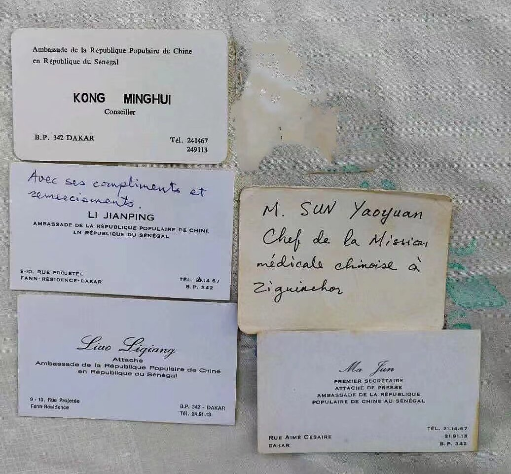 2018年7月,第17批援塞医疗队在达喀尔的一个社区开展义诊活动。一位身着浅绿色长袍的古稀老人颤颤巍巍地走到义诊台前,掏出几张保存完好的名片,这些名片的主人,是曾经在塞内加尔工作过的我驻塞使馆工作人员和医疗队老队长孙耀源。老人说,他曾在济金绍尔生活多年,经常受到中国医疗队的健康照护,成年后他离开济金绍尔,辗转到了达喀尔生活。他深情地问我们的队员,“你们认识他们吗?他们还好吗?”因为时隔多年,队员们不认识这些前辈,于是给我发回了名片。我查阅档案,孙耀源是第8批医疗队队长,原德化县医院院长,外科副主任医师,1989年12月-1991年12月在济金绍尔省卫生中心工作。看着这些历经岁月却平整如初的名片,我不禁动容,要怎样的深情,才能让一个人在迁徙流离中,将几张纸片珍藏三十年?